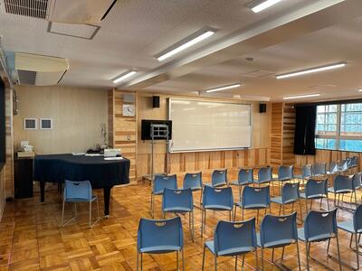 また、ピアノ等の楽器を使用するため、チョークの粉がでない白板(ホワイトボード)となっています。