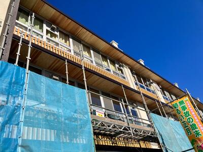東校舎(旧校舎)まわりの足場撤去が始まり、生まれ変わった外壁が少しずつ見えてきました。